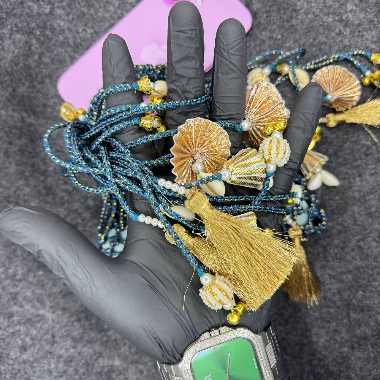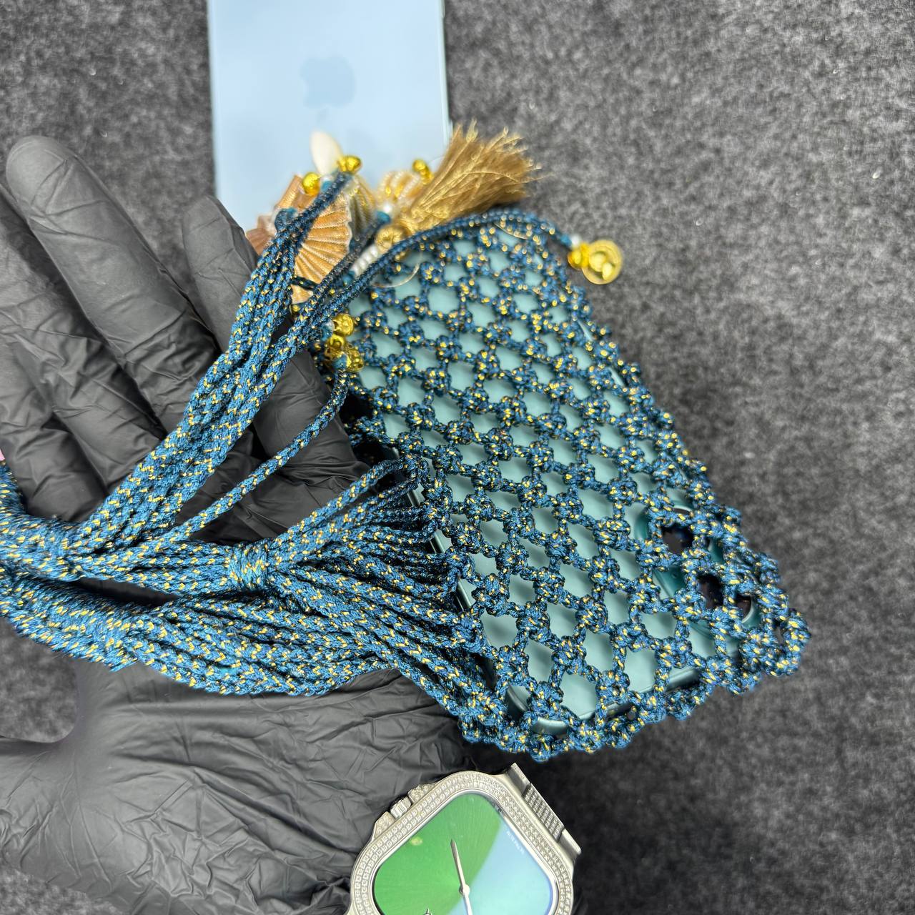 • Technique: It is made using intricate hand-knotted macramé or braided cord work. The pattern creates a mesh-like structure that fits snugly around the phone.