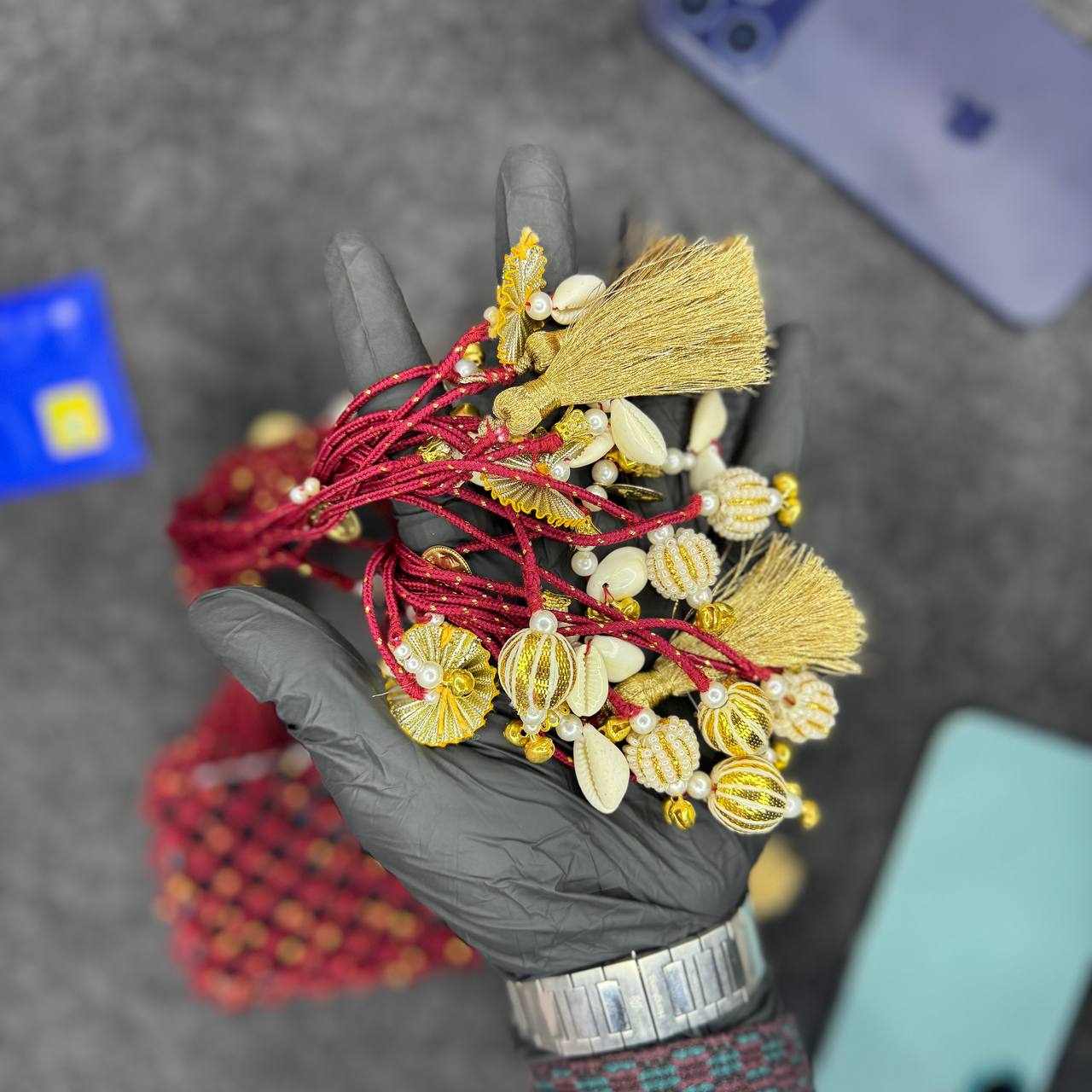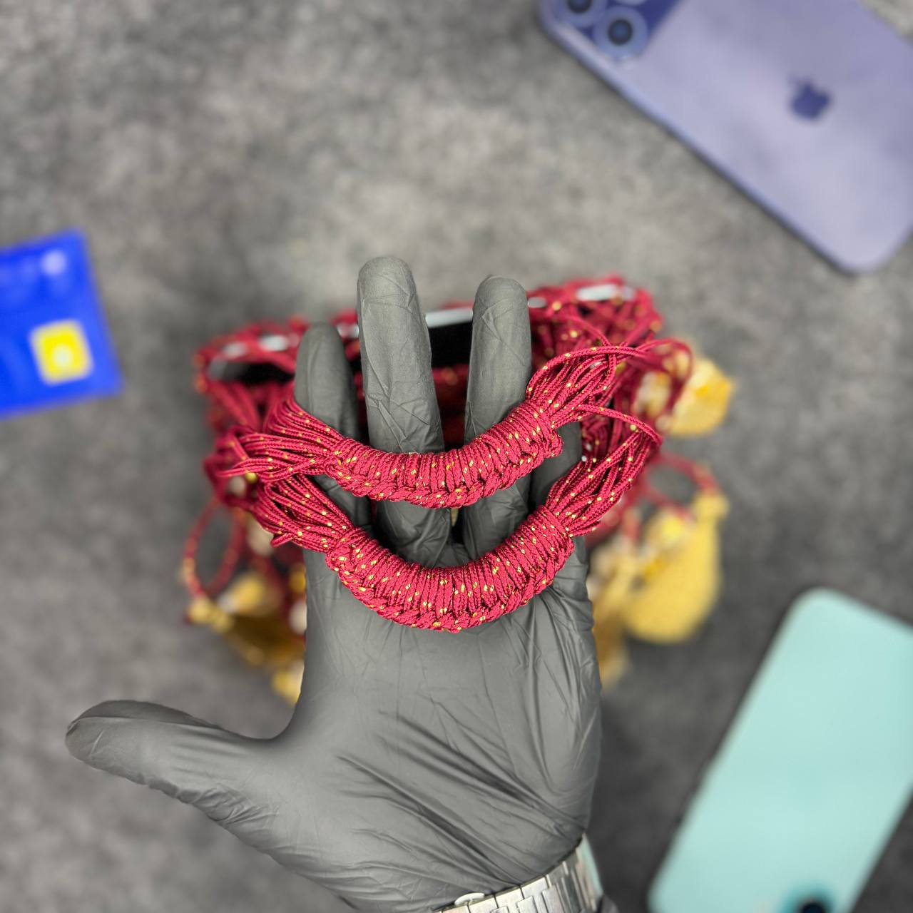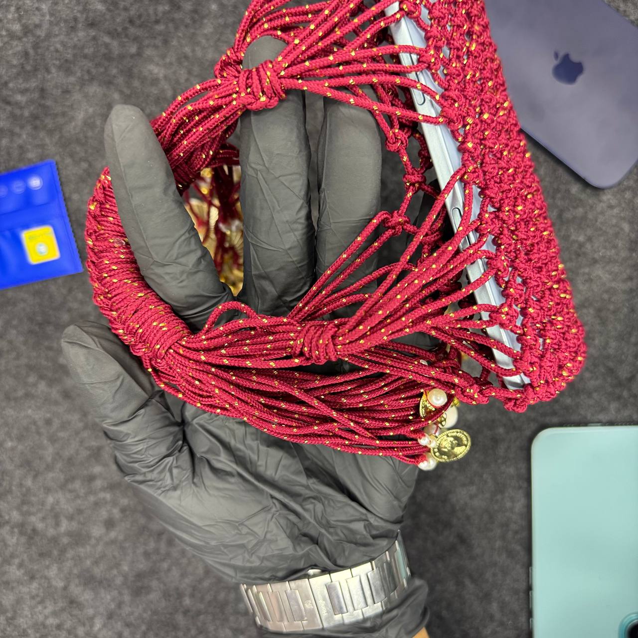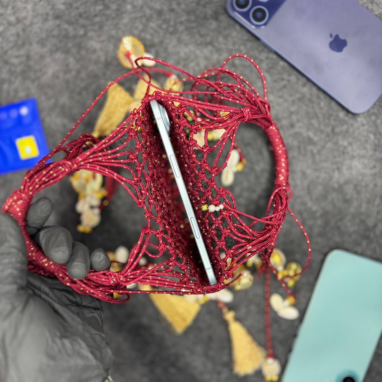 • Technique: It is made using intricate hand-knotted macramé or braided cord work. The pattern creates a mesh-like structure that fits snugly around the phone.