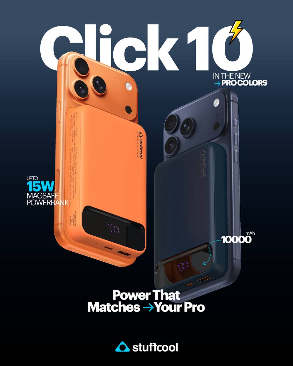 Introducing Click 10 – the magnetic wireless powerbank that's as powerful as it is portable! Designed for iPhone 12 and above, this sleek 10,000mAh powerhouse delivers fast 15W magnetic wireless charging, perfectly compatible with your iPhone and AirPods Pro. Need an extra boost? The 20W PD wired fast charging will have your iPhone juiced up to 50% in just 30 minutes! Click 10 features both Type-C and USB-A ports, so you can charge multiple devices with ease. With its premium colour range, this sleek powerbank adds a touch of sophistication Power meets elegance, all in one compact package while being proudly Made in India and BIS certified for quality and reliability. Stay charged, stay ahead with Click 10!